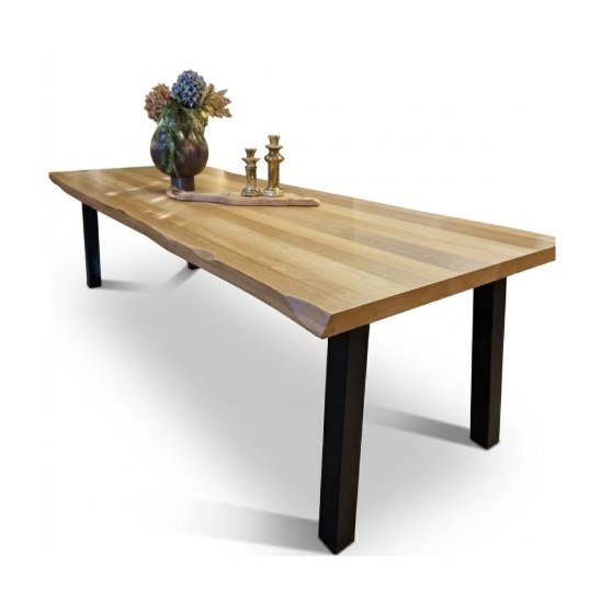 W tej konfiguracji stół wyposażono w cztery klasyczne, proste nogi wykonane z czarnej stali. Dzięki umieszczeniu ich w samych narożnikach blatu, mebel oferuje niespotykaną wygodę - biesiadnicy mogą swobodnie korzystać z całej długości stołu bez kolizji z nogami mebla. To solidna, stabilna konstrukcja, która mimo swoich gabarytów zachowuje szlachetną, minimalistyczną linię. Idealna baza do rodzinnych spotkań w jadalni o charakterze industrialnym lub nowoczesnym.