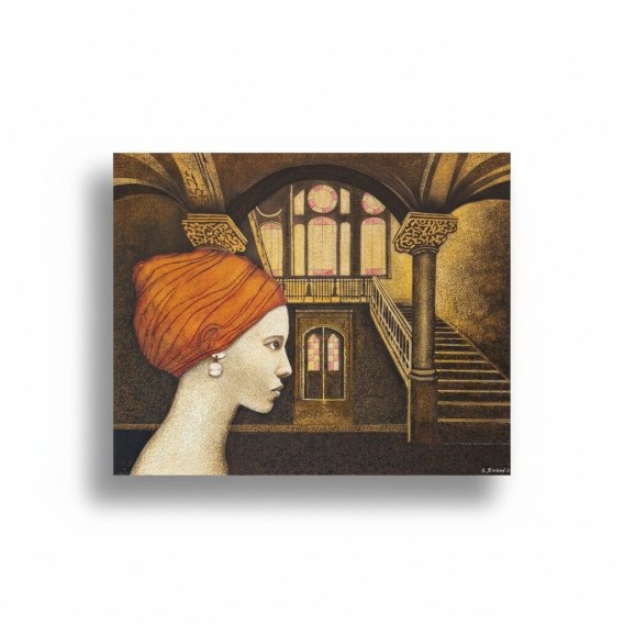 Pełny opis: Obraz "Strażniczka Wspomnień" to dzieło o niezwykłej, hipnotyzującej aurze, które przenosi widza do świata ciszy, kontemplacji i architektonicznego piękna. Kompozycja przedstawia profil kobiety w turbanie, której zamyślony wzrok skierowany jest w głąb monumentalnego, pałacowego wnętrza. Tajemnicza postać wydaje się być częścią tego miejsca, jego cichym obserwatorem lub uosobieniem jego duszy.