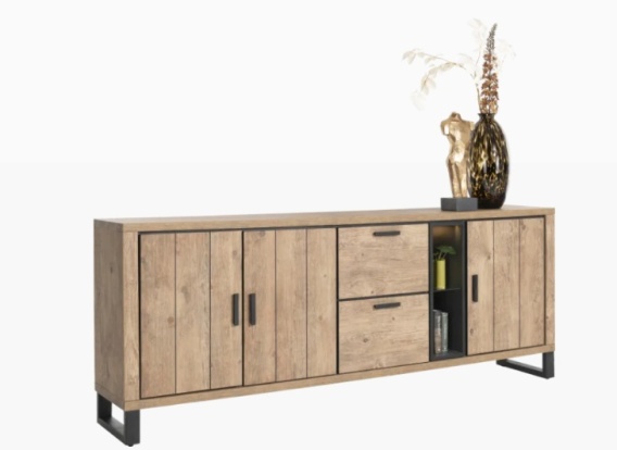 Kredens z kolekcji Pavarotti marki Henders & Hazel wykonany jest z łatwego w pielęgnacji Primo Laminato (HPL), materiału, który jest prawie nie do odróżnienia od prawdziwego drewna. Meble z tej kolekcji wykonane są w kolorze Barnwood, kolorze drewna emanującym przytulną wiejską atmosferą. Kredens ma 230 cm szerokości, ma 3 drzwiczki szafki, 2 przestronne szuflady i 2 otwarte półki, które są pięknie oświetlone energooszczędnym oświetleniem LED. Mebel wykończony jest drobnymi czarnymi metalowymi uchwytami i solidnymi nogami.