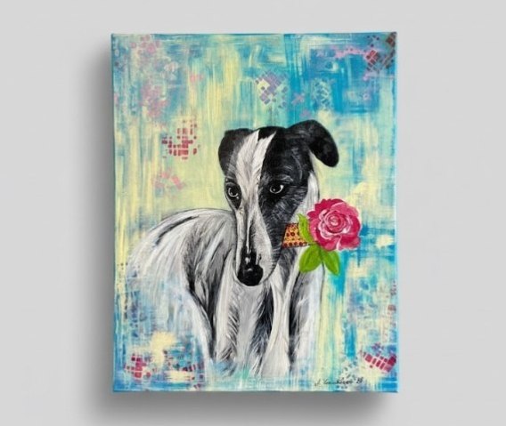 Obraz Ręcznie Malowany "Romantyczny Chart" - Pies z Różą 40x50 cm
