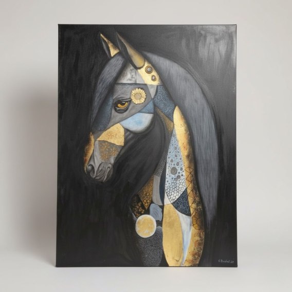 Tym, co nadaje obrazowi unikatowy charakter, jest jego mozaikowa struktura. Sylwetka konia została zbudowana z dziesiątek fragmentów o różnych wzorach i fakturach, przypominając drogocenną, złotą zbroję. Lśniące płatki szlagmetalu kontrastują z matową czernią i chłodnymi akcentami błękitu, tworząc dynamiczną grę światła i cienia. Każdy element - od geometrycznych wzorów po delikatne motywy roślinne - opowiada własną historię, składając się na spójną, hipnotyzującą całość.