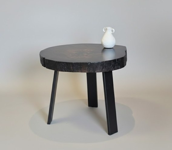Unikalny Stolik Kawowy HAGAN z blatem z litego czarnego dębu o naturalnym, nieregularnym kształcie (efekt "plastra drewna"). Blat jest profesjonalnie zabezpieczony, co gwarantuje trwałość. Stabilne, czarne metalowe nogi nadają meblowi elegancki, loftowy styl.