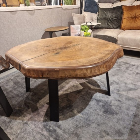 Stolik opiera się na trzech solidnych, prostych nogach wykonanych z czarnego metalu, które kontrastują z ciepłym odcieniem drewna, nadając całości nowoczesnego, a zarazem industrialnego charakteru. Wysokość stolika wynosi 55 cm, co jest idealną wysokością dla stolika kawowego.