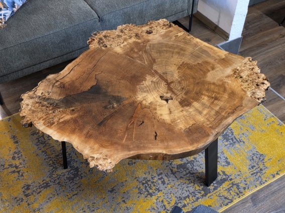 Ten niezwykle rzadko spotykany materiał to czeczota topoli. Blat stołu wyróżnia się dekoracyjnym rysunkiem słoi w postaci ciemnych i jasnych oczek, plamek, żyłek i drobnych sęczków otoczonych splątanymi włóknami drewna. To przepiękny i niezwykle malowniczy wzór, od którego nie sposób oderwać wzroku.