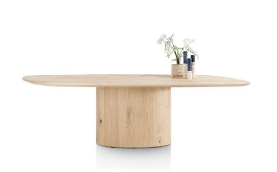 Blat stołu wykonano z litego dębu w kolorze natural sand, wykończonego matowym lakierem, który podkreśla strukturę drewna, jednocześnie zapewniając mu trwałość i odporność na codzienne użytkowanie. Centralna noga - kolumnowa, eliptyczna - została pokryta naturalnym fornirem dębowym. Co istotne, jej konstrukcja została od wewnątrz wzmocniona, co gwarantuje stabilność nawet przy dużym obciążeniu.