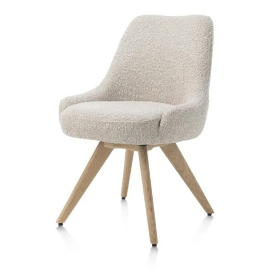 Krzesło jest tapicerowane modną tkaniną Brioni boucle w delikatnym, kremowym odcieniu. Tkanina boucle, znana ze swojej strukturze pętelkowej, jest niezwykle miękka i przyjemna w dotyku, przypominając zamsz, a jednocześnie gwarantuje luksusowy wygląd i wyjątkową trwałość. Mikrofibra, z której jest wykonana, jest odporna na intensywne użytkowanie i łatwa w czyszczeniu, co czyni Rocco idealnym wyborem do codziennego użytkowania w jadalni.