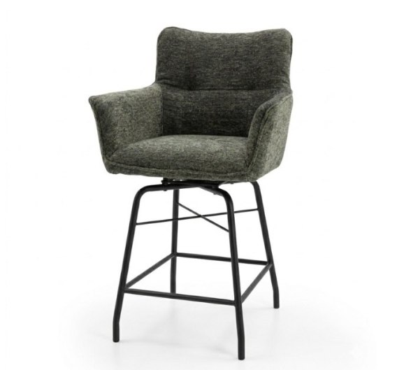 Charakterystyka mebla: Hoker Chiara to definicja nowoczesnego komfortu na wysokości. Posiada pełne, kubełkowe siedzisko z podłokietnikami, co sprawia, że siedzenie przy wyspie kuchennej jest równie wygodne, co w salonowym fotelu. Wyjątkowym detalem jest skórzany uchwyt (skóra Catania) na oparciu, który ułatwia odsuwanie krzesła. Tkanina Enzo w głębokim kolorze oliwkowym dodaje całości szlachetności - jej melanżowa struktura subtelnie połyskuje, zmieniając odcień w zależności od oświetlenia.