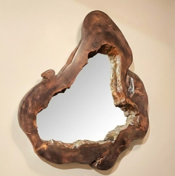 Artystyczny detal: Głęboki brąz ramy kontrastuje z jasną taflą lustra, a surowe, "wydrążone" krawędzie w środku dodają całości niesamowitej głębi.