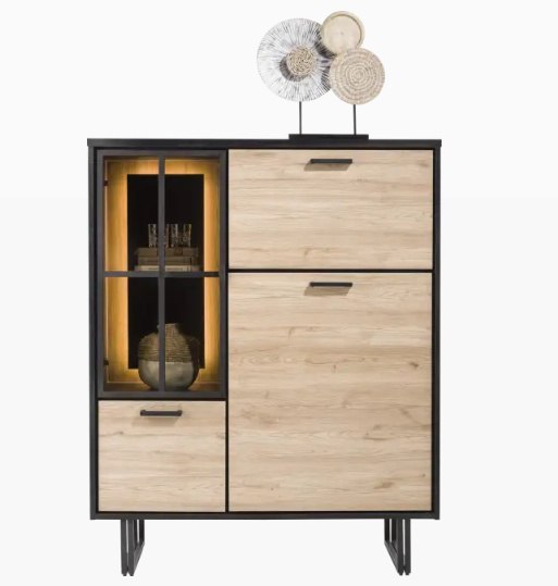 Widać ten wysoki kredens z kolekcji Avalon: solidny, o nowoczesnym designie. Wykonany jest z Primo Laminato i wykończony w kolorze drewna driftowego. Szafa posiada 2 drzwi, 1 drzwi szklane i 1 klapę. Zintegrowane oświetlenie LED za szklanymi drzwiami jest uderzające. Wysoki kredens ma 150 cm wysokości i 120 cm szerokości. Czarne metalowe akcenty i czarne wnętrze obudowy zapewniają fajne wykończenie.