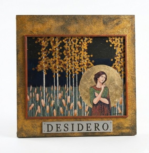 Obraz przenosi widza w magiczny, nocny las, gdzie tajemnicza kobieta z aurą wokół głowy stoi pośród wysokich pałek wodnych. Nad nią rozpościera się ciemne niebo usiane gwiazdami, a obok rosną drzewa o złotych, okrągłych liściach przypominających monety, symbolizujące obfitość i pragnienia. Poniżej sceny malarskiej, na surowej, fakturowanej metalowej ramie, przymocowana jest przestrzenna tabliczka 3D z wygrawerowanym napisem "DESIDERO", co w języku łacińskim oznacza "pragnę" lub "pożądam", nadając dziełu głęboki, symboliczny sens.