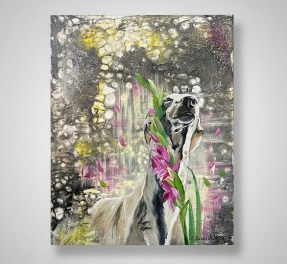 Obraz "Kwiatowa Błogość" to małe dzieło sztuki, które zatrzymuje chwilę czystego szczęścia i harmonii z naturą. Przedstawia portret charta (lub whippeta) z przymkniętymi oczami i uniesionym pyszczkiem, wyrażającego stan absolutnego relaksu i rozkoszowania się chwilą. Psu towarzyszy smukła łodyga różowo-fioletowych mieczyków (gladioli), które zdają się go delikatnie oplatać, a opadające płatki dodają scenie dynamiki i romantyzmu.