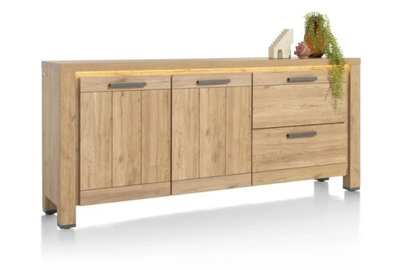 Choć kredens sprawia wrażenie masywnego, został wykonany z niezwykle łatwego w utrzymaniu materiału Primo Laminato w odcieniu Oak Natural, który do złudzenia przypomina naturalne drewno. Wbudowana listwa LED z funkcją ściemniania oraz dotykowy włącznik pozwalają stworzyć wyjątkowy nastrój w pomieszczeniu i dostosować intensywność światła do własnych preferencji.