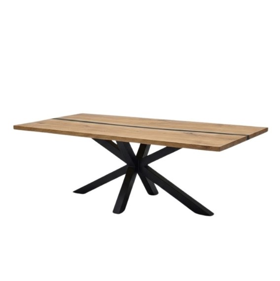 Stół dębowy z rzekami żywicy 'RIVER' 210x100 cm, blat lity dąb, nogi metalowe czarne