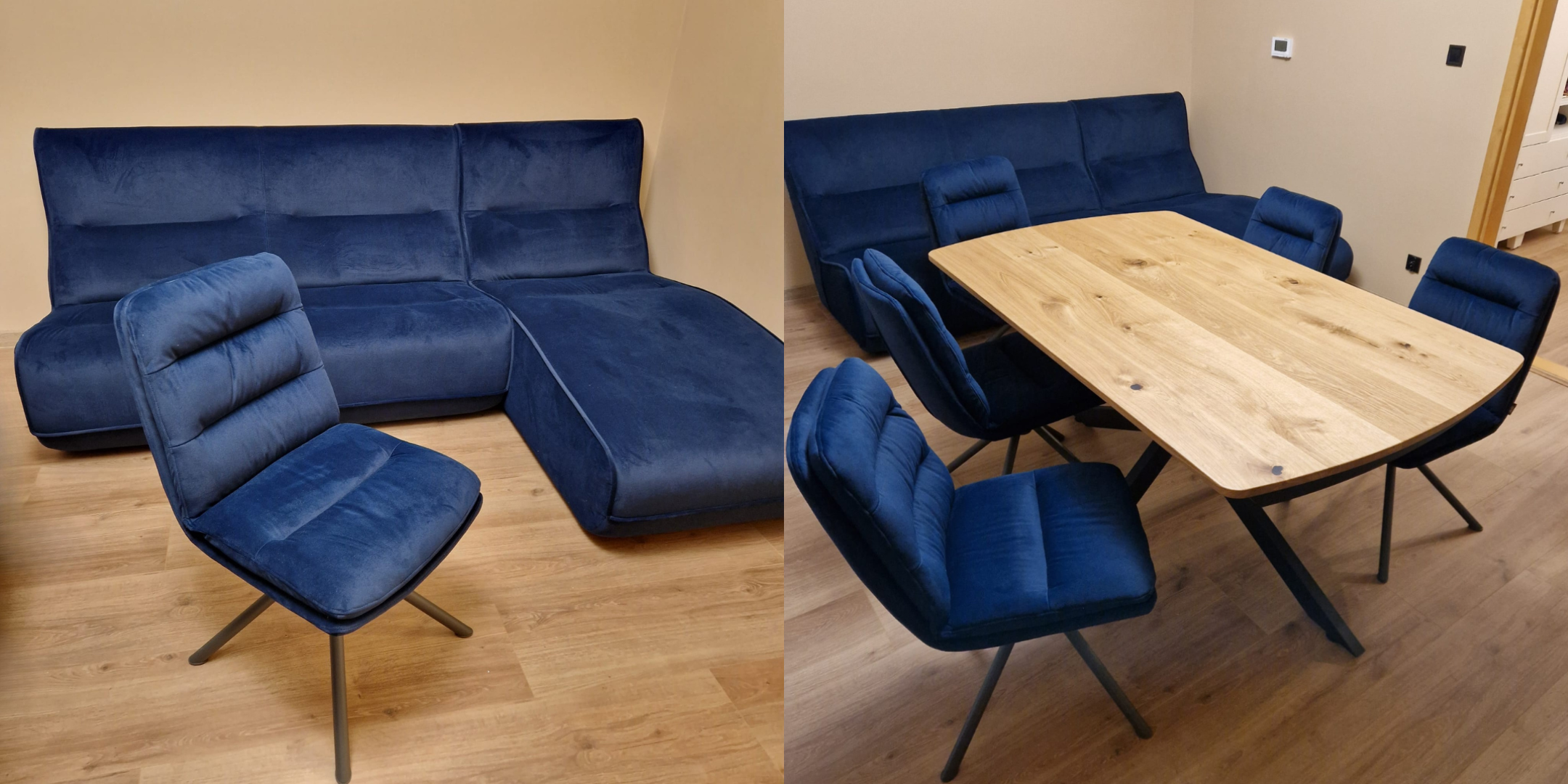Zarówno sofa, jak i krzesła, zostały ubrane w ten sam materiał. Wybór padł na tkaninę Spark w kolorze głębokiego, atramentowego granatu (nr 06). To nowoczesny matowy welur/velvet, który zmienia zasady gry.